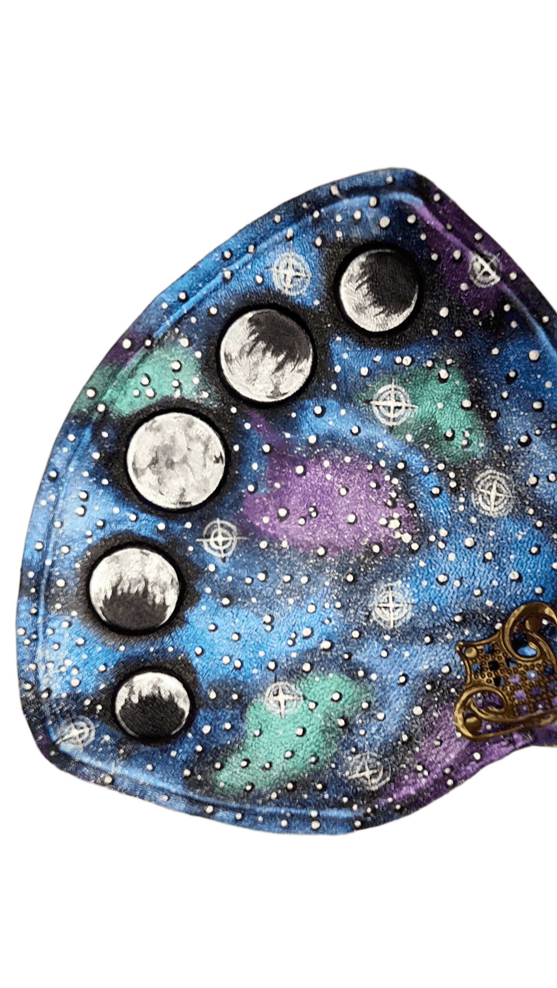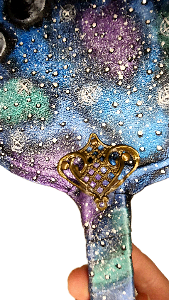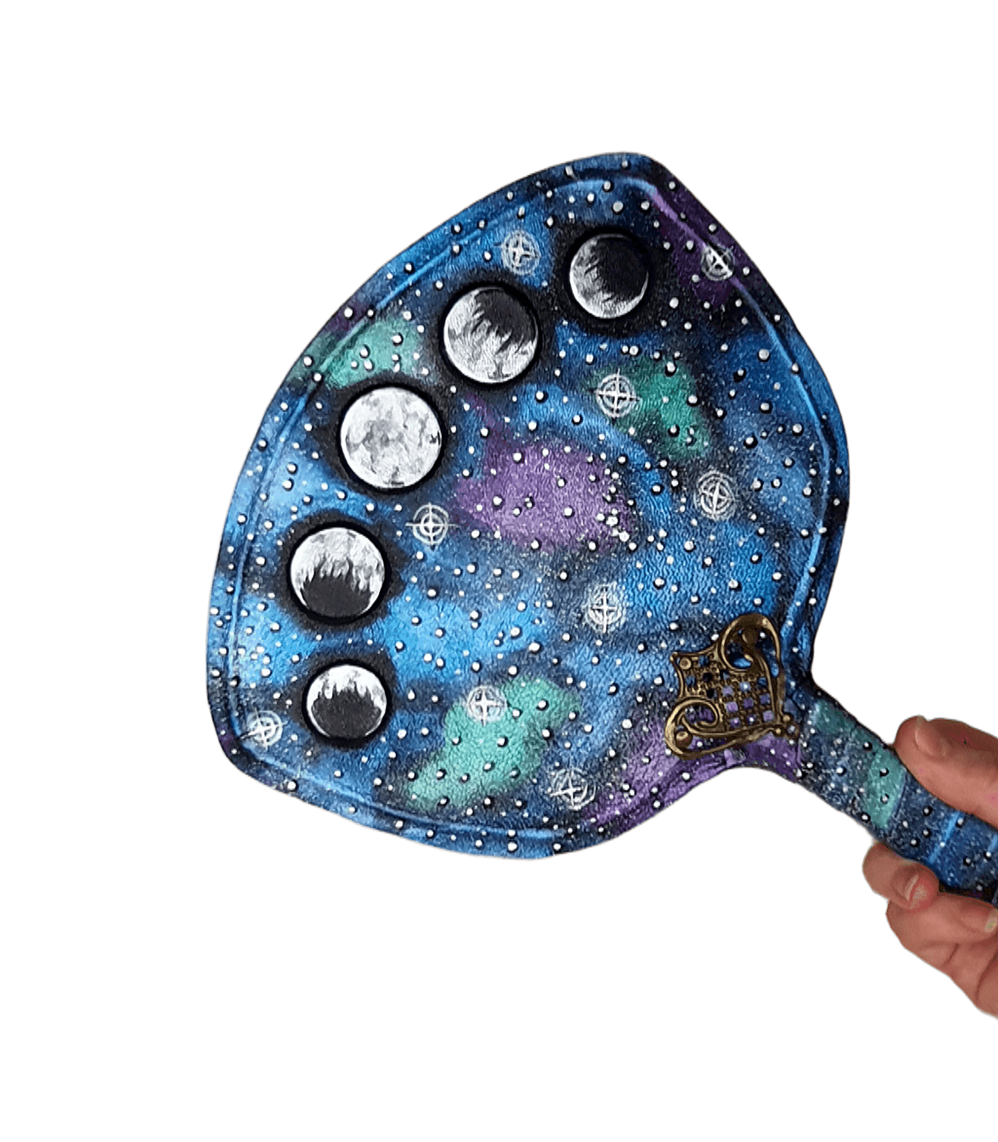 Unique hand fan made from high-quality leather with the phases of the moon against the starry sky. Painted with acrylic and glowing in the dark luminescent paints, covered with a protective polish.